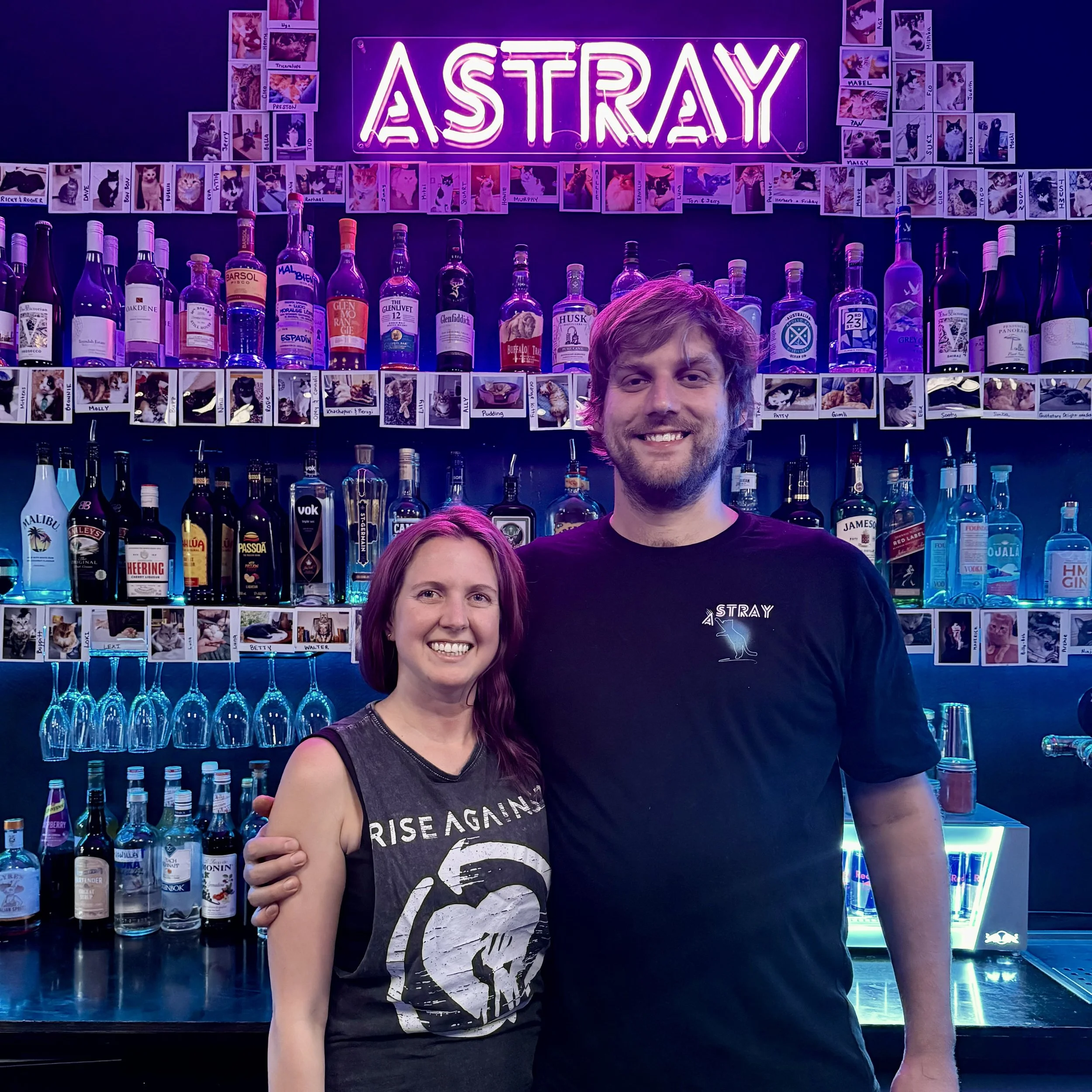 We’re Chris and Stephanie, and we own Astray (not ashtray). We opened this bar with a few simple things in mind: supporting local brewers and winemakers, serving delicious drinks, sharing friendly company. . . and celebrating an excessive love of cats!